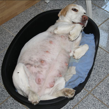 So dick wie auf dem Foto war Beaglehündin Yvi wenige Tage vor der Geburt ihrer Welpen. Sehnsüchtig haben wir ihre Welpen erwartet, war doch der letzte Versuch fehlgeschlagen. Nun aber war sie dick und rund, so dass selbst der Ahnungsloseste erkennen musste, dass Welpen im Anmarsch waren. Dass es große, lebendige Welpen werden würden, war deutlich zu spüren, konnte man doch jeden einzelnen ertasten.